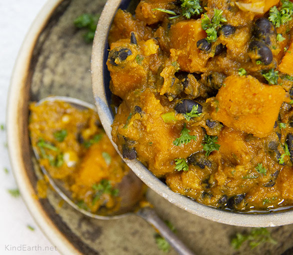 An quick and easy one pot vegan meal using squash, black beans and a delicious infusion of warming spices and herbs.