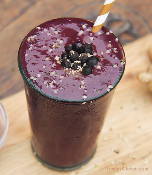 A healing, anti-inflammatory, anti-oxidant rich smoothie with fresh ginger, hemp seeds, maca root powder and blueberries.