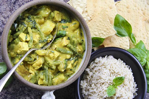 An easy green bean, tofu, and potato curry with coconut milk. This is vegan and high in protein.