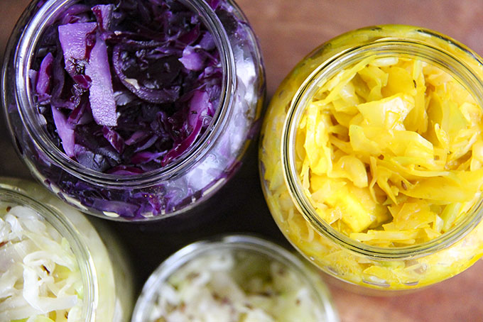 Homemade fermented sauerkraut using white cabbage, fresh ginger and either dried or fresh turmeric root and sea salt. This is an easy method to make at home in a jar.