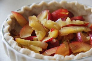 - Take about 10 ripe, juicy plums. Leave on the skins but take out the stones. Slice up and place into the pastry.[cap id="attachment_2173" align="alignright" width="300"][img src="https://www.kindearth.net/wp-content/uploads/2014/08/Plum-Pudding-Pie_z-300x200.jpg" width="300" height="200" class=" size-medium" title="Plum Pudding Pie inside"]Placing the plums in the pastry lined dish before adding the topping[/cap]