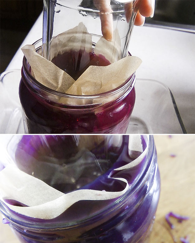 - Next, you will need to be sure to keep the cabbage beneath the brine during the fermenting period. Cut a piece of parchment paper and press it down onto the sauerkraut to form a lid that is sinking into the brine whilst holding the veggies down. Alternatively, tear one of the outer cabbage leaves to size and press down until the sauerkraut is submerged in its own brine. Then weigh down with a clean jar (filled with water or clean rocks if more weight is required). Pop a loose-fitting lid or cloth on top (be sure that you don’t seal your jar, because there may be pressure inside as the ferment develops which will need to escape).
