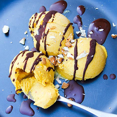 A drizzle of melted chocolate on your vegan mango ice cream